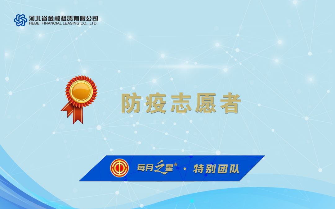 8,河北金租一方面抓業務促投放,積極創新業務模式和打磨服務產品,一方面積極落實區域防疫政策,以責任傳遞租賃溫度,為疫情防控貢獻力量。工會委員會評選出本月“每月之星”,請優勝團隊和優秀員工珍惜榮譽,再立新功,請全體干部員工以先進為榜樣,再接再厲,再創佳績